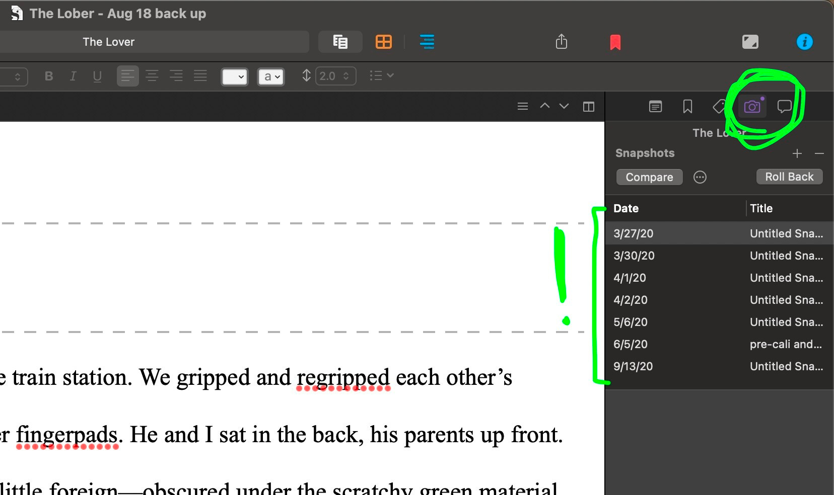 On the right side of the screen, you’ll find a little camera icon. If you click it, you’ll create a “snapshot,” i.e., a version of the document as it is in that moment. This means that (1) you can easily revert writing back to the way it was previously; (2) you don’t need to save a new version of your document every time you’re making a change you aren’t sure you’ll keep.